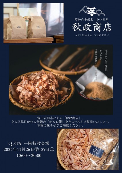 富士吉田市の老舗かつお節店 「秋政商店」 が、11/26(水)〜29(土) の4日間、キュースタに初登場します。