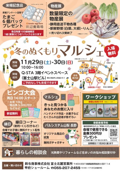 📅 11月29日(土)・30日(日)🕙 10:00〜16:00📍 Q-STA 3階イベントスペース※ご予約なしでご来場いただけます●来場者プレゼントアンケートご回答で「たまご6個パック」をプレゼント!(各日先着100組)● 物産展(数量限定)静岡直送の干物、新鮮野菜、りんごなどが勢ぞろい!※売り切れ次第終了●ビンゴ大会(両日14:00~)お米10kg、商品券5,000円分など豪華景品が当たる!参加無料✨●マルシェハンドメイド作品やお菓子など、たくさんの出店者さんが集まります!●縁日コーナー(射的・くじ引き)お子様向け無料チケット配布あり!●ワークショップ(体験は有料)クリスマス飾りをつくって楽しめる人気企画✨🏠暮らしの相談会光熱費やリフォームなど住まいのお悩みを専門スタッフがサポート!ご家族・ご友人とぜひ遊びに来てください😊