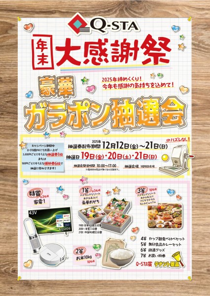 \Q-STA 年末大感謝祭/豪華カラポン抽選会 開催今年も1年の感謝を込めて、ワクワクドキドキのガラポン抽選会を実施します!● 抽選券配布期間12月12日(金)〜21日(日)●抽選日12月19日(金)・20日(土)・21日(日)時間:10:00〜17:00場所:1階 特設会場🎁 豪華景品はこちら!・特賞:家電✨・1等:ハイランドリゾート ホテル&スパ 豪華おせち🍱・2等:お米10kg🌾・そのほか、テナント景品も盛りだくさん!Q-STA館内でのお買い物で抽選券、抽選補助券をGETできます!今年の締めくくりに、ぜひ運試しにチャレンジしてください😊皆さまのご来館をお待ちしております✨