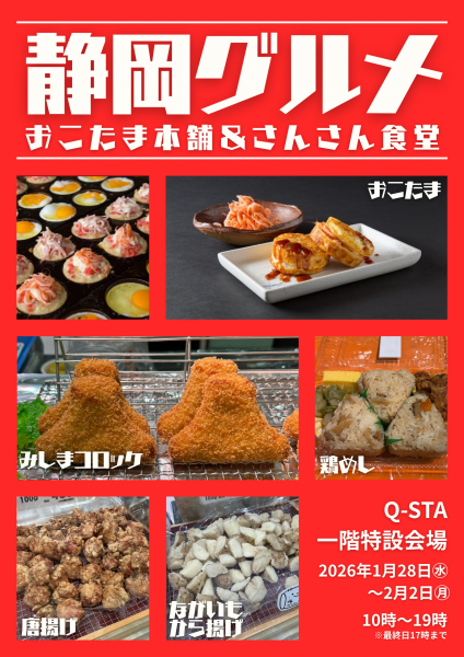静岡グルメ 集結!静岡の“おいしい”がQ-STAにやってくる!おこたま本舗 & さんさん食堂期間限定出店✨2026年1月28日(水)〜2月2日(月)10:00〜19:00※最終日は17:00まで●おこたま本舗生地とたまごで地元食材をサンドした食べやすい新感覚お好み焼き「おこたま本舗」片手で食べやすいからおやつにもランチにもぴったり🙌●さんさん食堂・みしまコロッケ・唐揚げ・ながいもから揚げ・鶏めし などなど…おかずにも、ランチにも、おつまみにも!家族みんなで楽しめるラインナップです。この機会にぜひご賞味ください😋