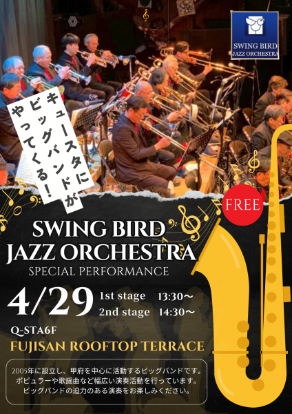 🎷ビッグバンドがやってくる!🎺SWING BIRD JAZZ ORCHESTRASPECIAL PERFORMANCE 開催!迫力満点のビッグバンドサウンドを富士山を望む屋上で楽しめる特別ステージ✨なんと…観覧無料!📅4月29日(祝)📍Q-STA 6FFUJISAN ROOFTOP TERRACE🕐1st stage 13:30〜🕑2nd stage 14:30〜甲府を中心に活動するジャズオーケストラが、ポピュラーから歌謡曲まで幅広く演奏🎶春の心地よい空気の中で、迫力ある生演奏をぜひお楽しみください!※天候により内容が変更となる場合がございます
